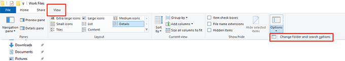 - Click on the View menu at the top and you’ll reveal several new options. Find the option that says Options, click on it, and select Change folder and search options.