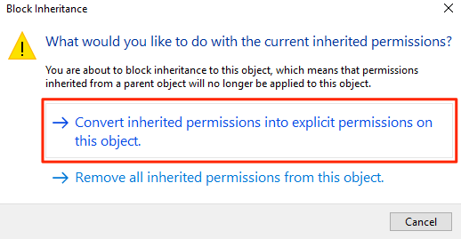 - A prompt will appear with two options in it. Select the one that says Convert inherited permissions into explicit permissions on this object.