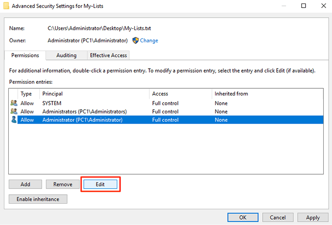 - You’ll now see all of your user accounts listed on your screen. Click on the account that you want to prevent from deleting your file and then click on the Edit button. It’ll let you edit the file permissions for your selected account.