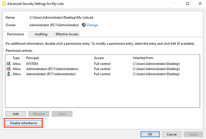 - The following screen lets you define permissions for your selected file. Click on the Disable inheritance button to be able to modify the file permissions.