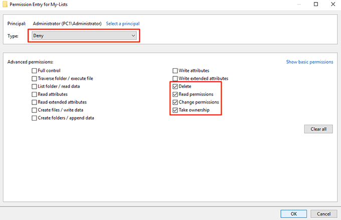 - Make sure to click on Show advanced permissions on the following screen so you can see all the available permissions. Also, select Deny from the Type dropdown menu. Then, tick-mark the following options and these permission privileges will be taken away from your selected user account. **A) Read permissions B) Change permissions C) Take ownership D) Delete ** Click on OK when you’re done to save the changes