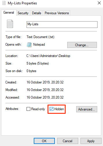 - You’ll be in the General tab by default. At the bottom of your screen, you’ll find an option saying Hidden. Tick-mark the option and click on OK.