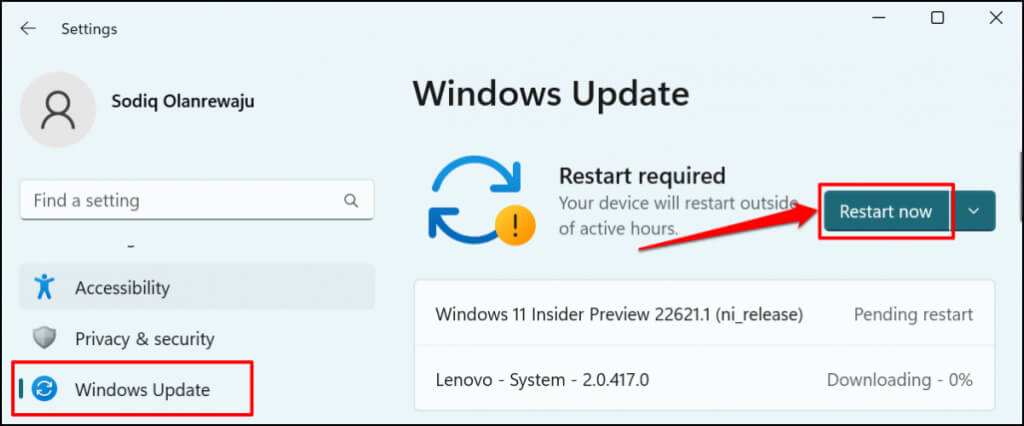 On Windows 11 computers, go to Settings > Windows Update and wait while your PC checks and downloads new updates. Select Restart now to install previously downloaded updates.