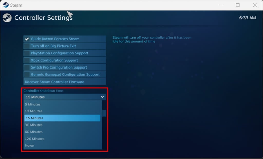 - Open the Controller shutdown time drop-down menu and select an extended timeout period. Select Never if you don’t want Steam to disconnect your PS5 controller automatically.