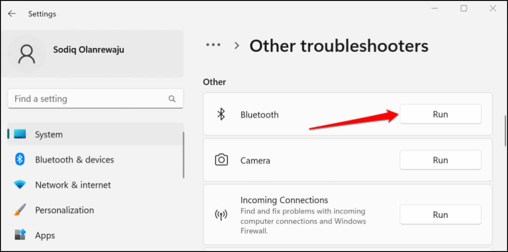 - Scroll to the “Other” section and select the Run button next to Bluetooth.