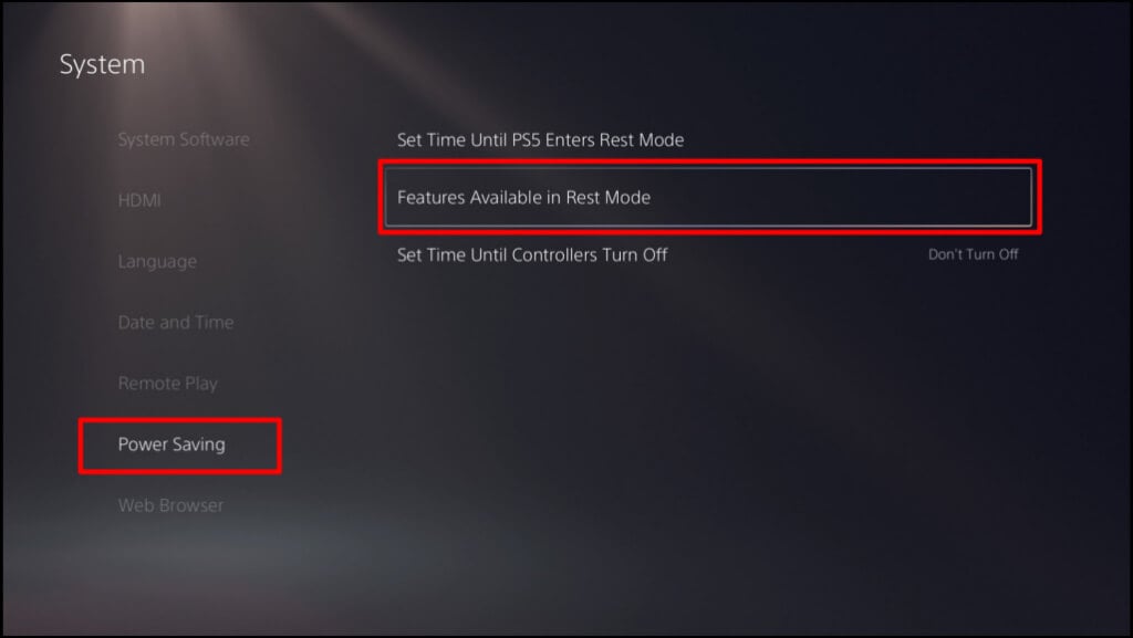 Go to Settings > System, select Power Saving on the sidebar, and choose Features Available in Rest Mode.