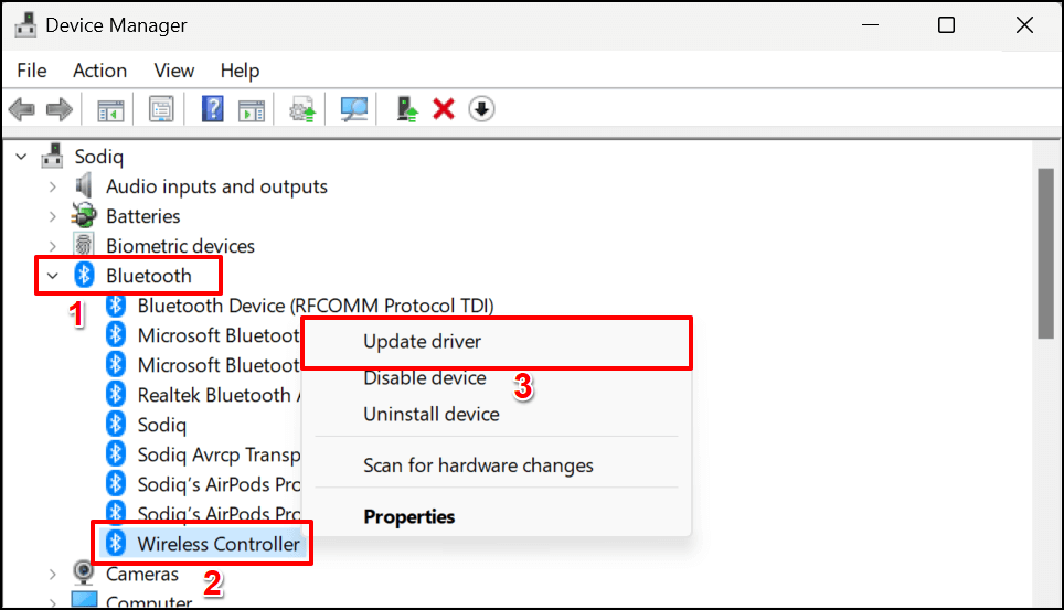 - If you connect the controller wirelessly, expand the Bluetooth category, right-click the Wireless Controller driver, and select Update driver.