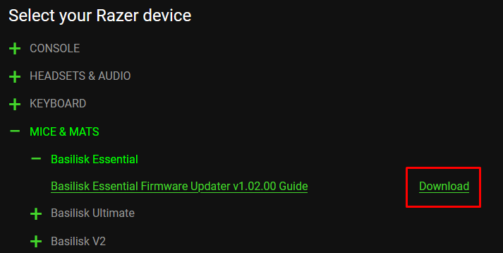- Click on a green plus symbol next to the Mice and Mats (or any other peripheral you want the latest drivers for). * Find your device on the list and click Download next to it.