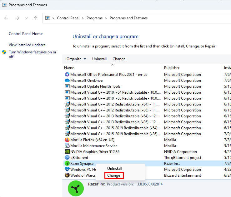 - Find Razer Synapse on the list of programs, and right-click it. Select Change.