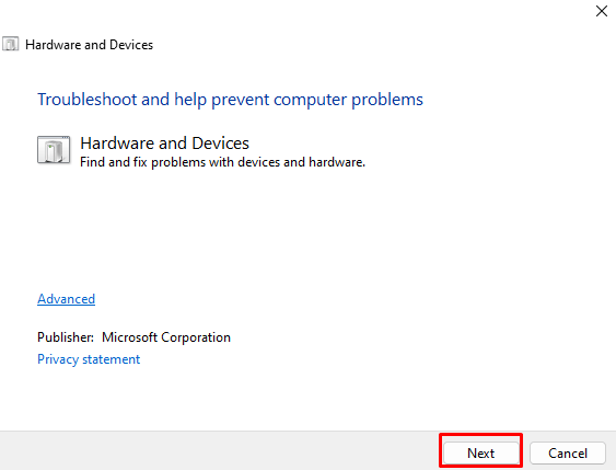 - This will open Hardware and Devices troubleshooter. Click Next.