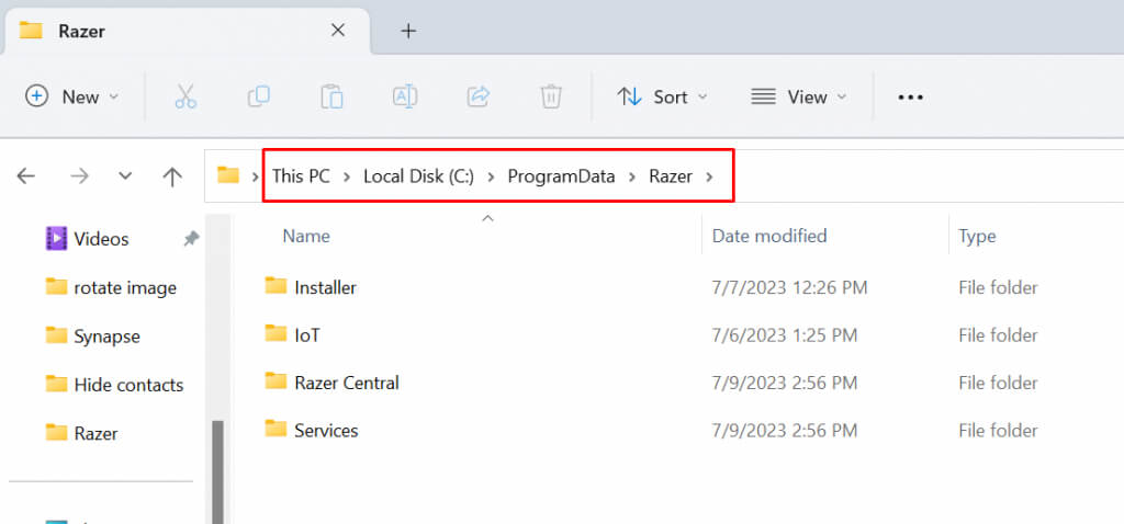 - Delete all the files in the Razer folder. Select them with your mouse, and press the DEL button on your keyboard. * Go to C:\ProgramData\Razer and ensure the Hidden items option in the ribbon is checked.