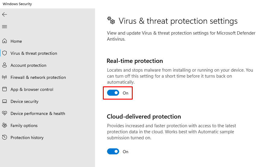 Go to Settings > Privacy & Security > Windows Security > Virus & threat protection to temporarily disable Windows Defender.