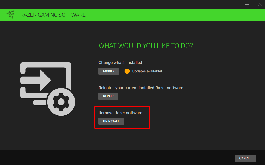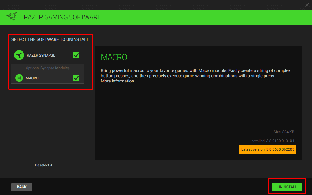 - Select all Razer software and click the Uninstall button in the lower right corner.