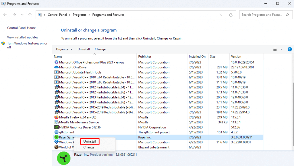 - Find Razer Synapse in the list of programs and right-click it. Select Uninstall.