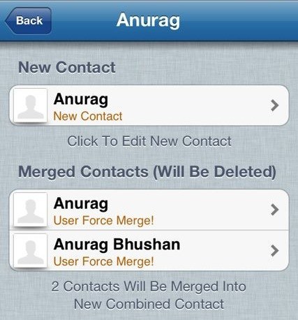 Now you can see what information is inside the two separate contacts and how the new merged contact will look. The only problem I have found with the app so far is that it likes to automatically choose the contact with the shorter name. So as you can see above, instead of choosing Anurag Bhushan as the new contact, it chose Anurag. Everything gets merged just fine. To fix this issue, you have to tap on the new contact and then you’ll see an Edit button at the top right.
