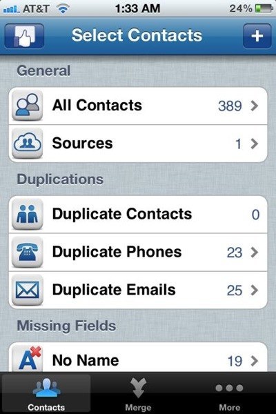The app can basically show you duplicate contacts (same name), duplicate phone numbers, duplicate email addresses, contacts with no name, contacts with no phone number and contacts with no email. Here’s what it looks like when you first run it: