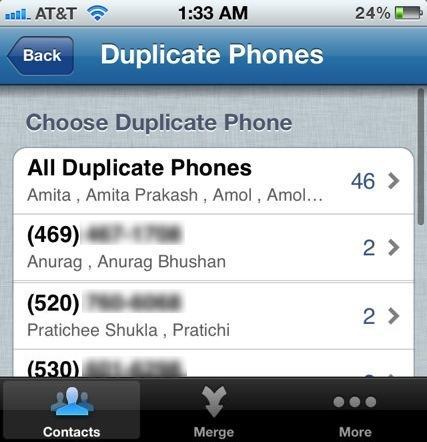 If you tap on Duplicate Phones, for example, you’ll see a list of contacts grouped by the same phone number.