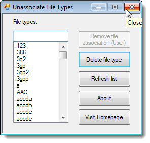 To close the Unassociate File Types tool, click the X button in the upper, right corner of the dialog box.