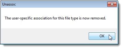 Once you click the Remove file association (User) button, a dialog box displays telling you that the custom file association has been removed from the registry. Once you remove a file type association the Unassociate File Types tool, Windows will use the default, global file association settings for that file type.