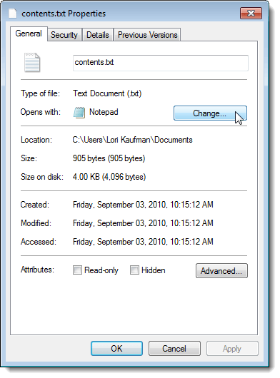 You can also right-click on the file whose association you want to change and select Properties from the popup menu. Then, click the Change button on the General tab.