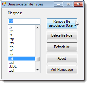 On the Unassociate File Types main window, select the desired file extension from the File types list. To remove the user-specific, custom association, for the chosen file type, click the Remove file association (User) button. This changes the default program used to open the file when you double-click on a file of that type.