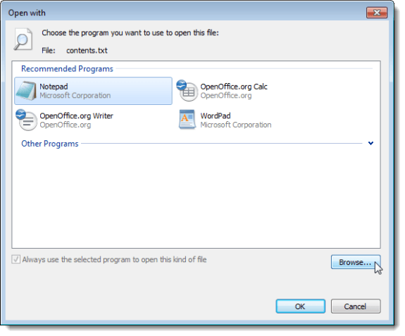 NOTE: By default, the program you choose on this dialog box will always be used to open other files of the same type as the selected file. The Always use the selected program to open this kind of file cannot be unchecked.