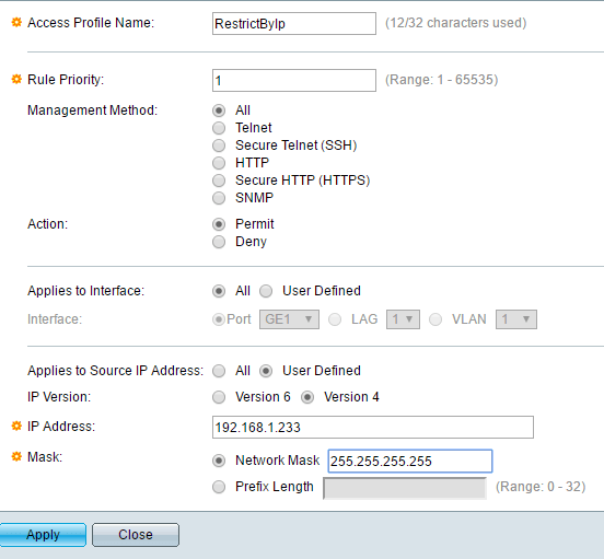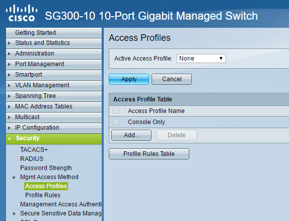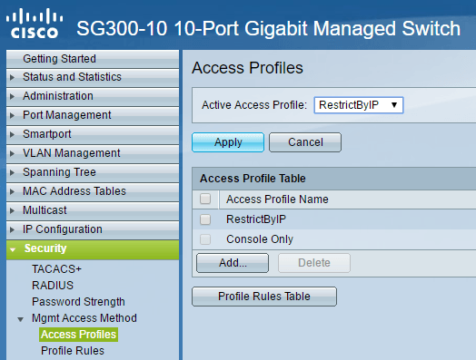 *Note: The following method I am going to describe also allows you to restrict access to any number of enabled services on your switch. For example, you can restrict access to SSH, HTTP, HTTPS, Telnet, or all of these services by IP address. *## Create Management Access Profile & Rules