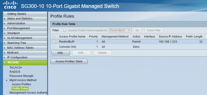 I ended up sifting through the 500-page manual to figure out how to go about blocking all IP addresses except the ones that I wanted for management access. After a lot of testing and several posts to the Cisco forums, I figured it out! In this article, I’ll walk you through the steps to configure access profiles and profiles rules for your Cisco switch.