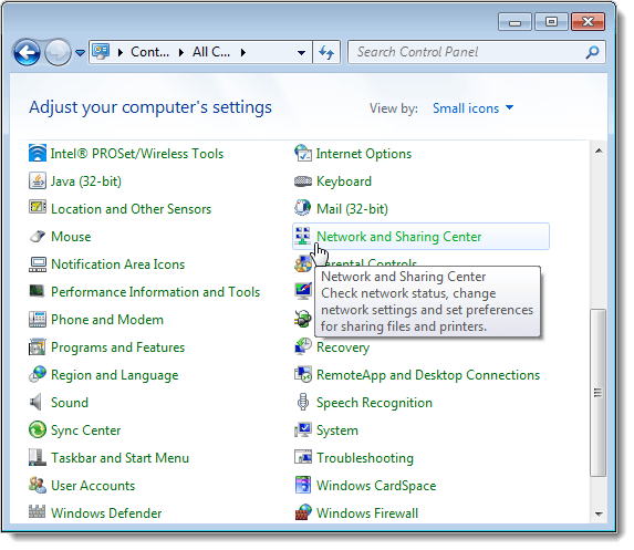 If you have selected Small icons (or Large icons) as the Control Panel view, all available items on the Control Panel are available. Click Network and Sharing Center.