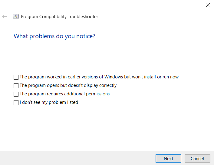 - The troubleshooter will now prompt you to select the problems you are facing in running your application. Based on this information, Windows will select appropriate compatibility settings for you.