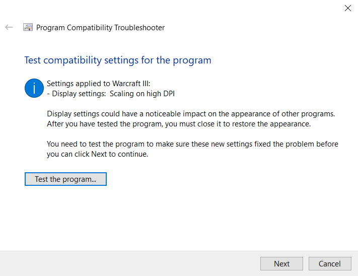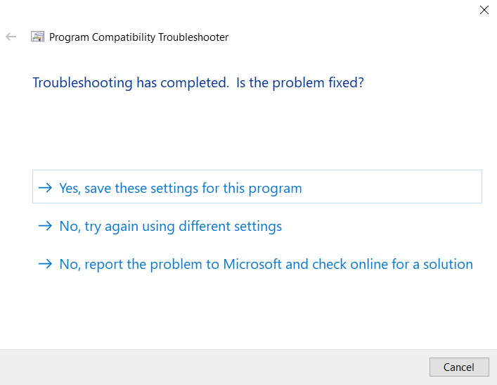 - If the program worked correctly, select **Yes, these settings for this program. **Otherwise, you can select **No, try again using different settings** to attempt running the program with other settings. Just hit **Cancel** if you want to close the troubleshooter without saving the settings.