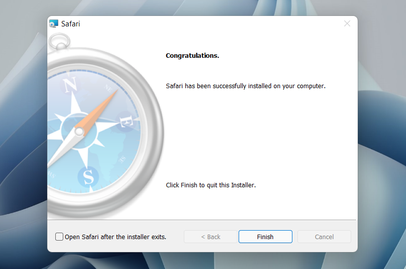 - Wait for the Safari installer to finish installing Safari on your computer. Then, select Finish.