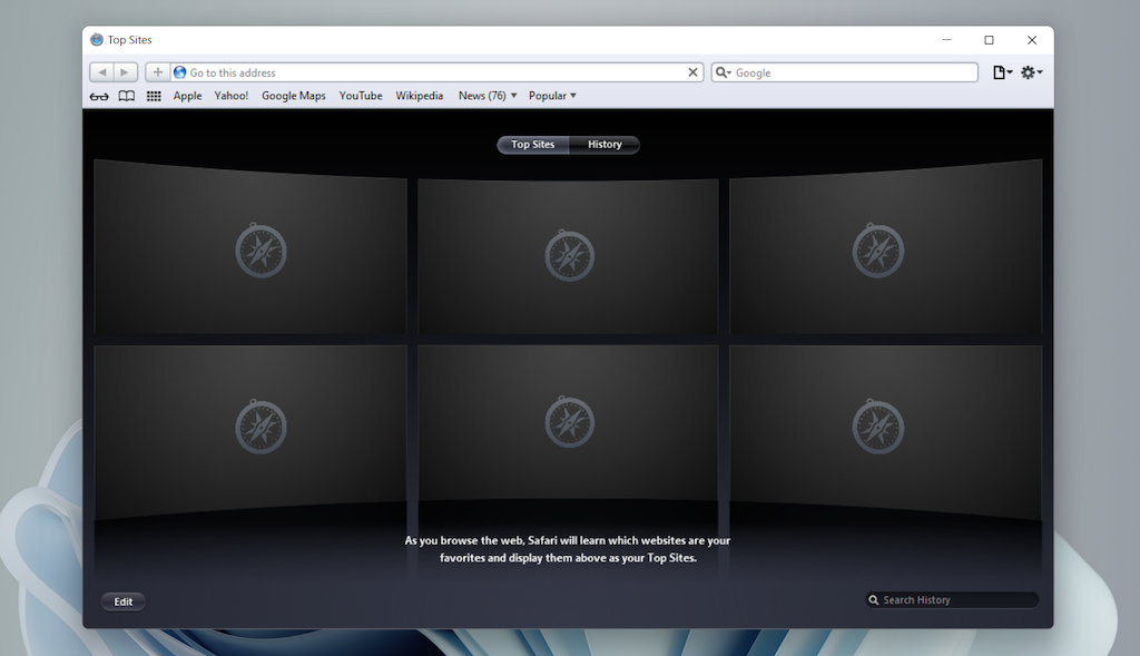 Despite being almost ten years old, Safari for Windows doesn’t look too out of place. To the top, you have the familiar URL bar (you can’t use it to perform searches, however), a Bookmarks strip underneath, and a dedicated Search bar on the left corner. By default, new tabs display frequently visiting sites in thumbnail format—you can use the Top Sites and History tabs to switch them and your browsing history.