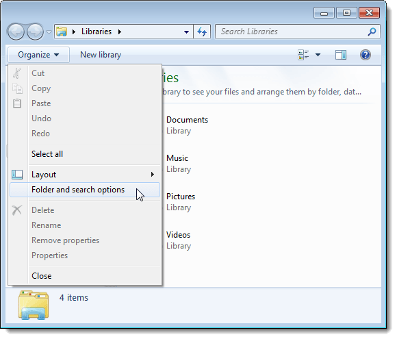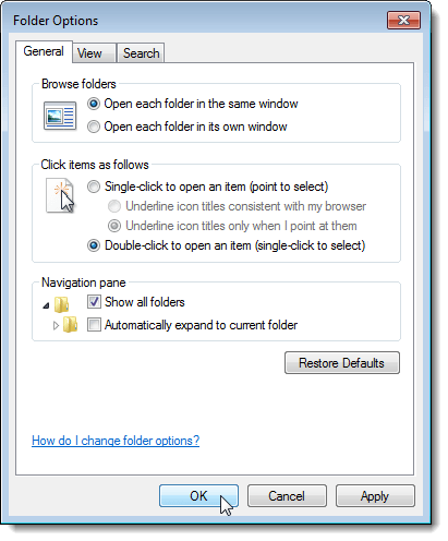 To restore the classic navigation tree, open Windows Explorer, click Organize, and select Folder and search options from the drop-down menu.