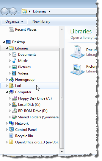 Now, the Desktop group displays, showing all the Libraries, your user folder, Computer with all drives (even currently unused) showing, Network, Control Panel, and Recycle Bin.