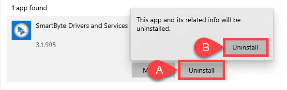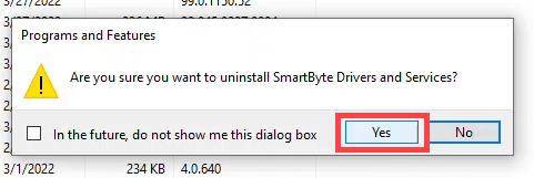 - A prompt will ask you if you’re sure you want to uninstall SmartByte Drivers and Services. Select **Yes**.