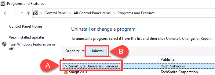 - In the **Programs and Features **window, find and select **SmartByte Drivers and Services**, then select **Uninstall**.