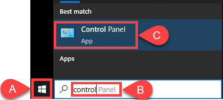 - Select the **Start **menu and start typing *control *to find the Control Panel. Once found, open it.