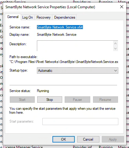 - To disable SmartByte, double-click on it and the **SmartByte Service Properties **window opens.