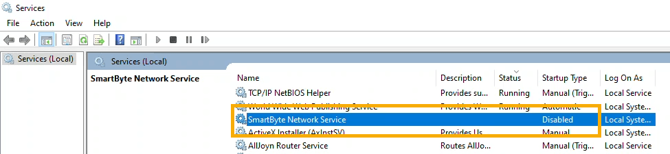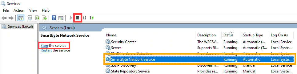 - Find the **SmartByte **service. This can be done quickly by single clicking any service and then start typing smartbyte. To only stop the SmartByte service, select it and then select **Stop **the service in the service description area or the stop button in the toolbar.