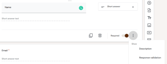 At the bottom of each question box, you can duplicate, delete, make the question optional or required, add a description, or add criteria for response validation.