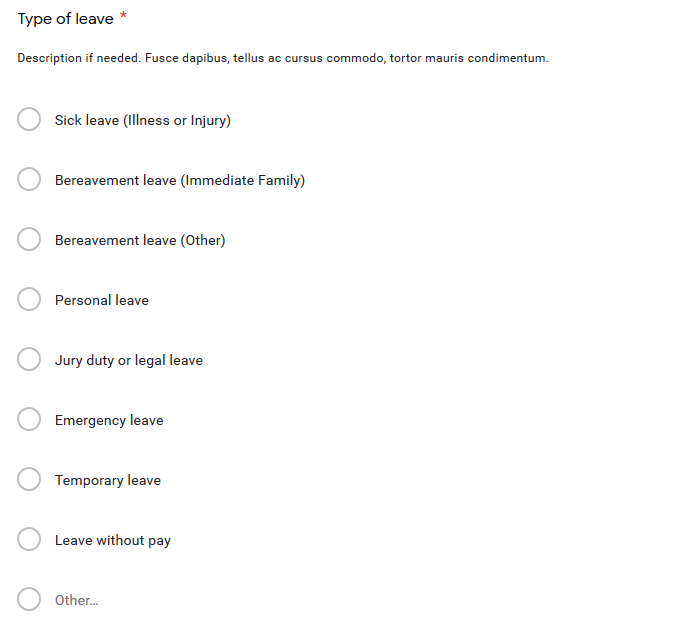 Include the reason for the request for time off to provide a way to track time off, such as sickness, personal, and bereavement.
