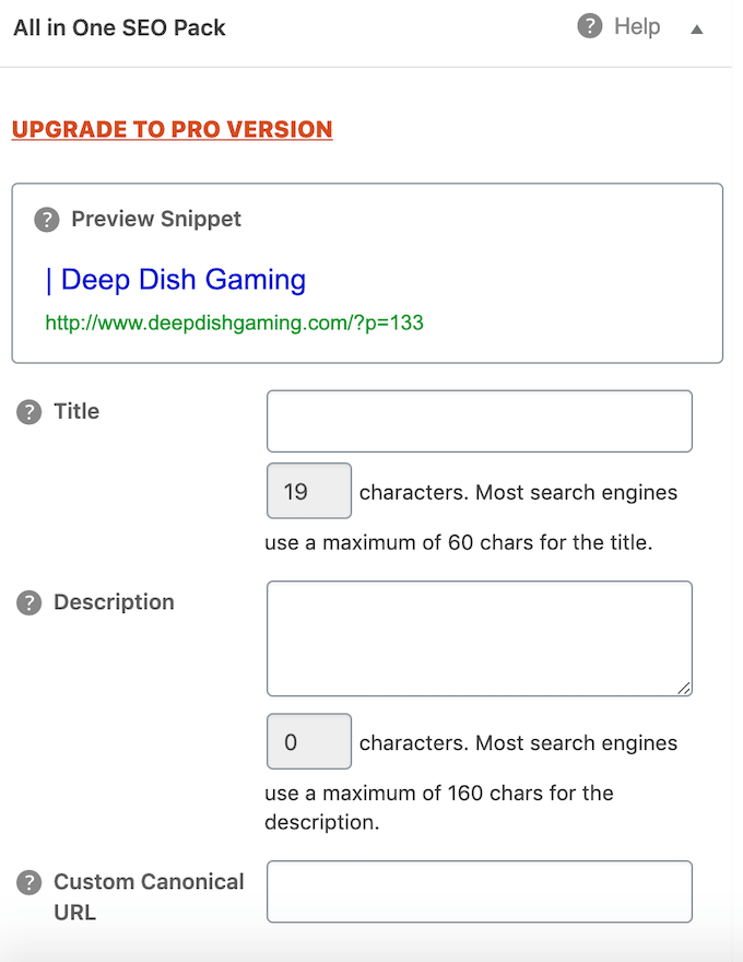 Like the Yoast plugin, All in One SEO has a free and a paid version. The free version has all of the basic features, as you can see in the screenshot above. You can create a custom title, meta description, and URL.