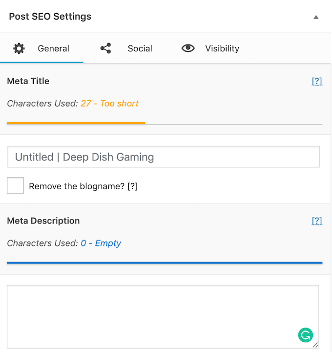 The plugin appears below the WordPress text box for the post and has three tabs: General, Social, and Visibility. * The General tab allows you to edit the meta title and meta description, and a colored bar graph and description beside the text boxes indicate how optimized they are.