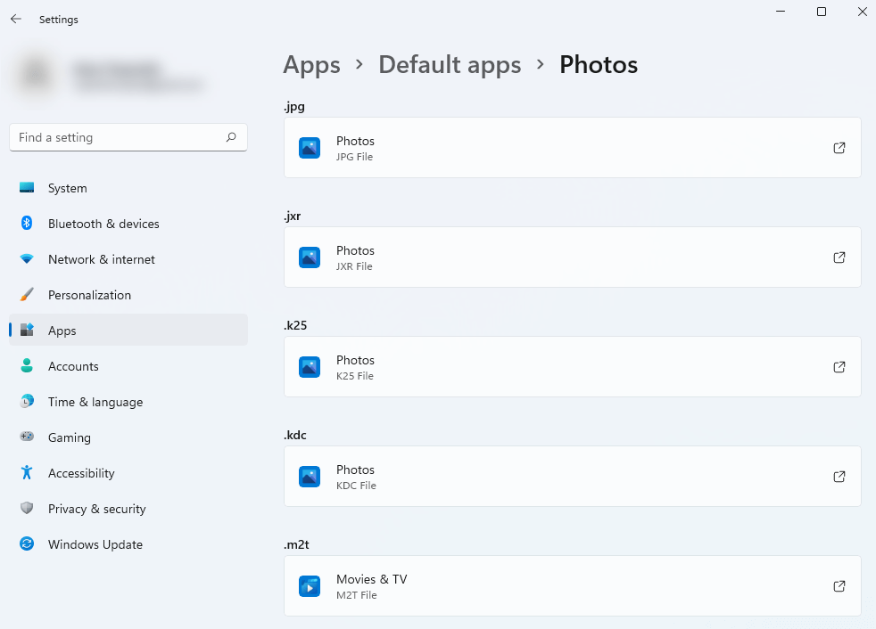 For instance, say you want to open all image files with a new photo viewer you installed instead of the Photos app. You’ll need to go to **Win + I **and navigate to **Apps **> Default apps > Photos and change the default app for each file type.