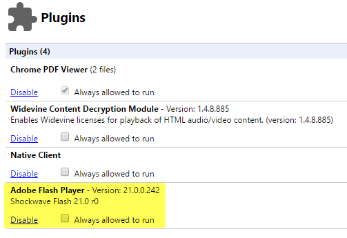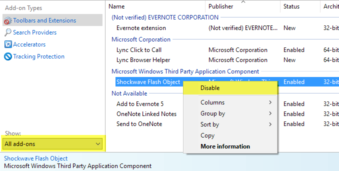 Under Show, select All add-ons and then right-click on Shockwave Flash Object and select Disable. If you are using Google Chrome, type in chrome://plugins in the address bar and then click on Disable under** Adobe Flash Player**.