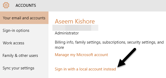 Secondly, what if my Microsoft account gets hacked or something else? Do I have to worry about someone being able to remotely log into my computer, etc.? Instead of worrying about all of that, just use a local account like you were with Windows 7 and earlier. To do that, click on Start, type account and then click on** Manage your account**.