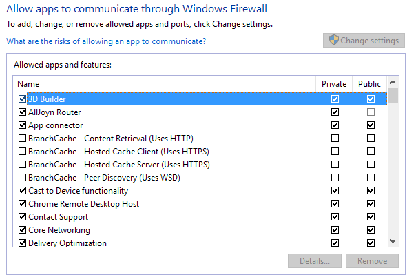 You’ll notice there are two columns with check marks: Private and Public. Check out my post on the Network and Sharing Center in Windows 10 to learn the difference between public and private networks. The more items you can uncheck from the Public column, the better your security. Items like File and Printer Sharing or Netlogon Service should never have a check in the Public column. You’ll have to Google to figure out which items you can uncheck.