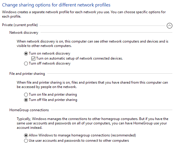 * Turn off network discovery (Only if you never access other devices on your network using this PC) * Turn off file and printer sharing * Allow Windows to manage HomeGroup connectionsGuest or Public