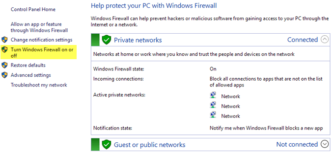 If your screen shows green shields with check marks, that means the firewall is On. If not, click on Turn Windows Firewall on or off to enable it. Next, you should click on Allow an app or feature through Windows Firewall to pick the programs that should have free access through the firewall.